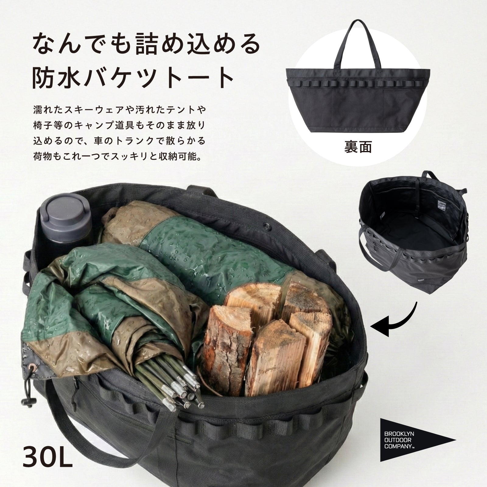 濡れたテントも薪も運べる防水バケツトートリサイクル100%のポリエステルを使用し外側はハードなオックスフォード地、内側はTPU加工で防水に仕上げた何でも詰め込める大型30Lと超大型60Lのトートです。濡れたスキーウェアや汚れたテントや椅子等のキャンプ道具もそのまま放り込めるので、車のトランクで散らかる荷物もこれ一つでスッキリと収納可能。