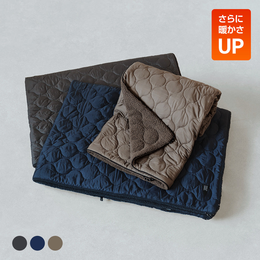 大人気のシェルパフリースを裏地に使用したエコダウン(シンセティックダウン)のパフブランケットが、新たに反射熱で体温を逃さないサーマルアルミシートを内蔵しエコダウンの中綿も増やすことで、さらにポカポカに生まれ変わりました。