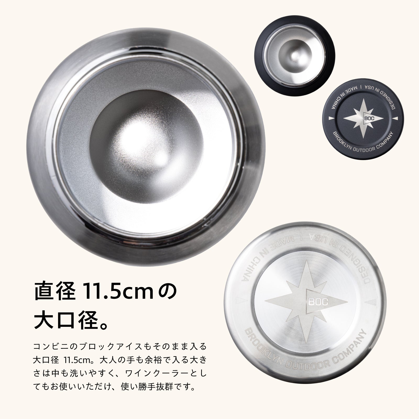 ③ 冬場でもお湯やコーヒーを朝まで温かくキープ。25-30度の夏場も最長6日間氷が残る高い保冷力。④ 直径11.5cmの大広口は、ワインクーラーとしても使えます。