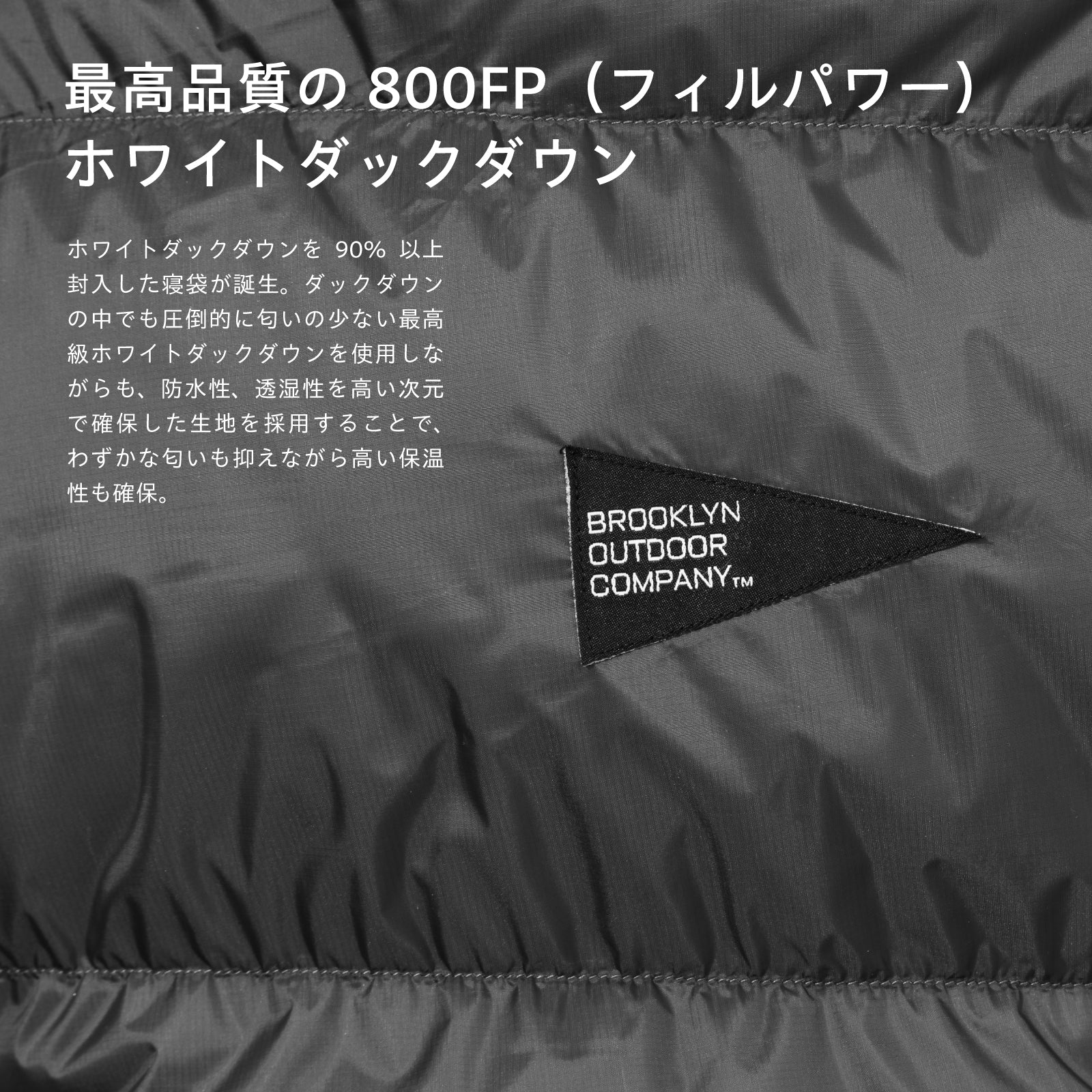 グースダウン同様に高騰を続ける最高品質の800FP(フィルパワー)ホワイトダックダウンを90%以上封入した寝袋が誕生しました。ダックダウンの中でも圧倒的に匂いの少ない最高級ホワイトダックダウンを使用しながらも、防水性、透湿性を高い次元で確保した生地を新たに採用することで、僅かな匂いも抑えながら高い保温性も確保。もちろん抜群の暖かさだけでなく800FPのふんわり度は化繊ではなし得ない圧倒的なコンパクトさも両立しています。
