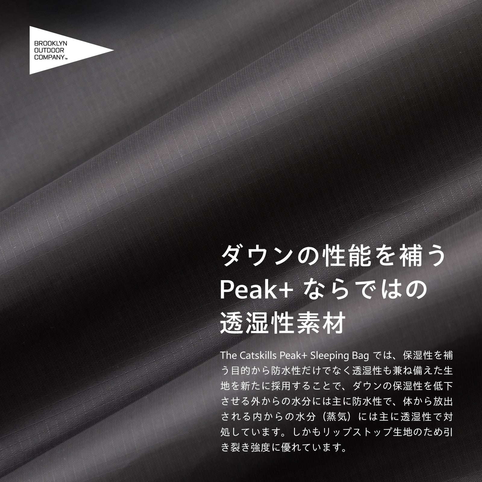 The Catskills Peak+ Sleeping Bagでは、保温性を補う目的から防水性だけでなく透湿性も兼ね備えた生地を新たに採用することで、ダウンの保温性を低下させる外からの水分には主に防水性で、体から放出される内からの水分(蒸気)には主に透湿性で対処しています。しかもリップストップ生地のため引き裂き強度に優れています。